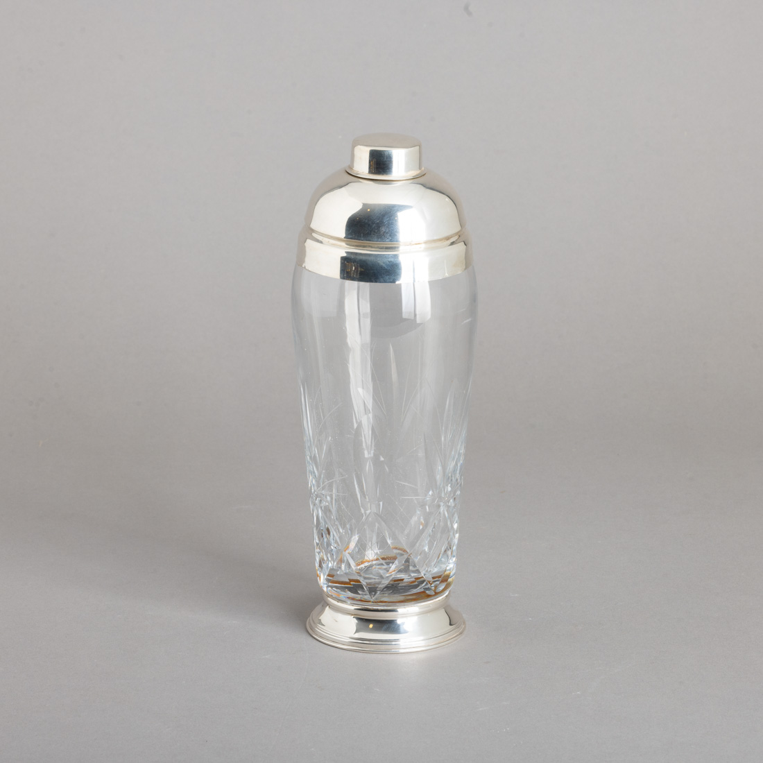 Em cristal decoração gravada, tampa e base com aro em prata espanhola de 915 marcas de garantia de teor (pós 1934), decoração lisa. Sem marcas portuguesas, ao abrigo do Decreto-Lei n.º 120/2017. Sinais de uso e amolgadelas.