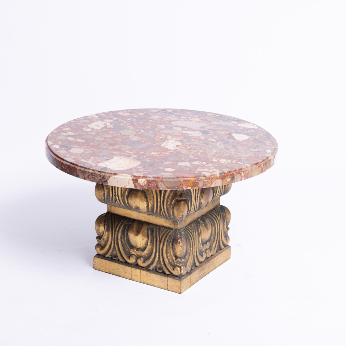 Em madeira entalhada e dourada, tampo redondo em mármore (esbeiçadelas). Pequenas falhas e defeitos.