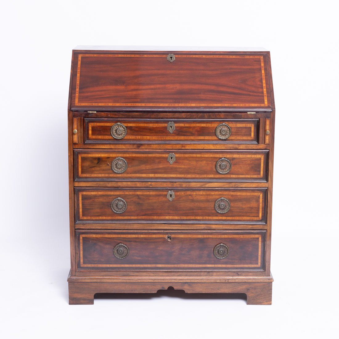 Estilo D. Maria, em mogno e raiz com embutidos, de quatro gavetas, no interior escaninhos, ferragens em metal amarelo. Pequenos defeitos e falhas nas ferragens.