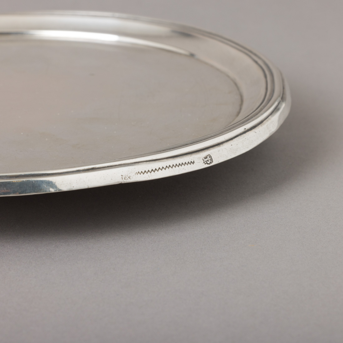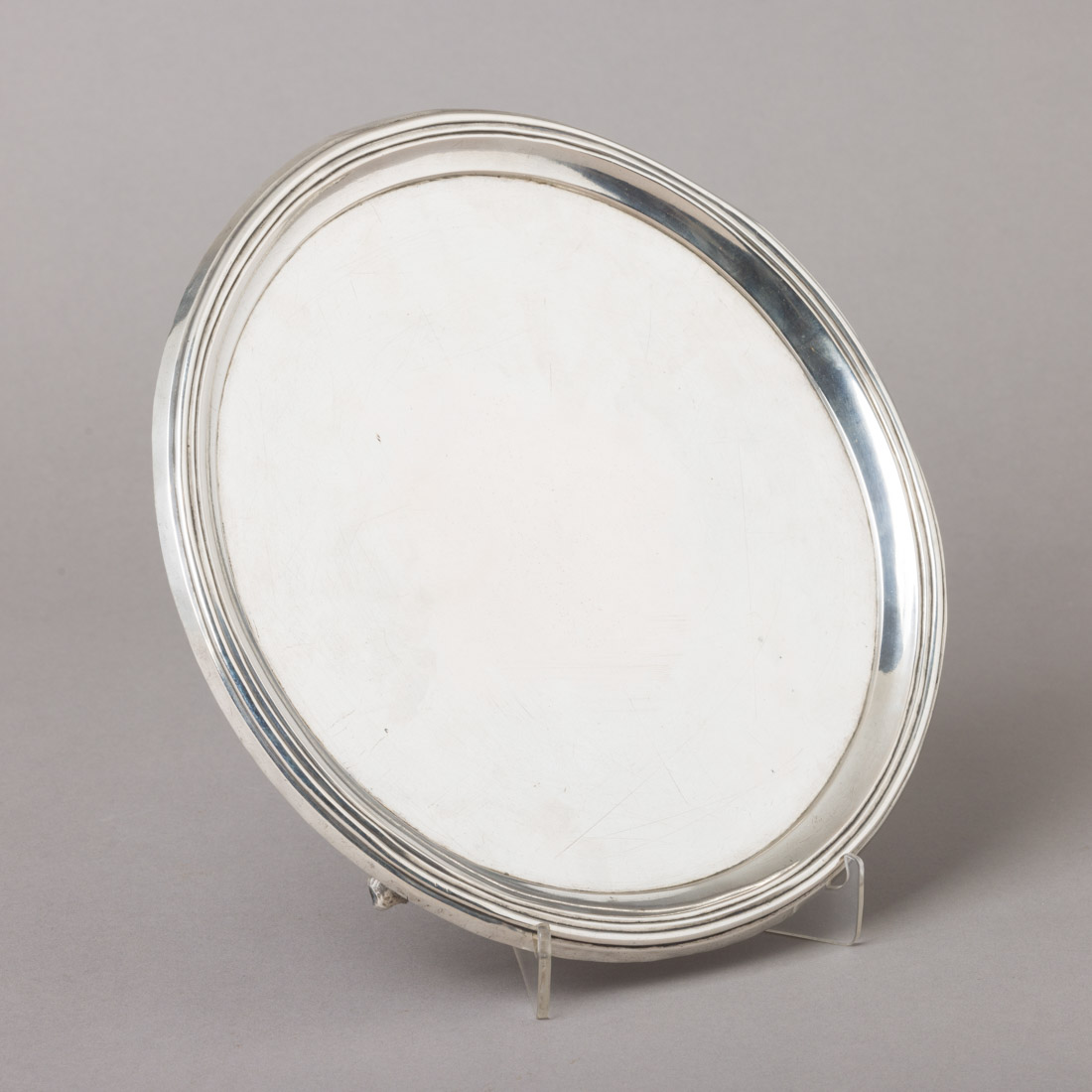 Em prata portuguesa do Séc. XIX, marca de ensaiador do Porto (P-41) e de ourives (P-428) Luís António Rodrigues de Araújo, decoração lisa, pé de garra e bola. Sinais de uso e amolgadelas na aba. Peso aprox.: 474 g.