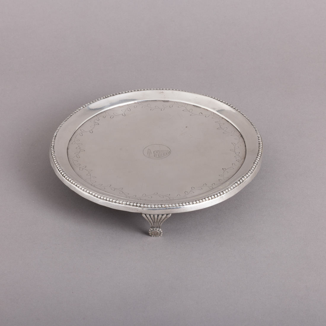 Em prata do Séc. XIX, decoração gravada "grinaldas e paisagem com casa" bordo relevada com friso de perlados. Sem marcas, ao abrigo do Decreto-Lei n.º 120/2017. Sinais de uso e amolgadelas.