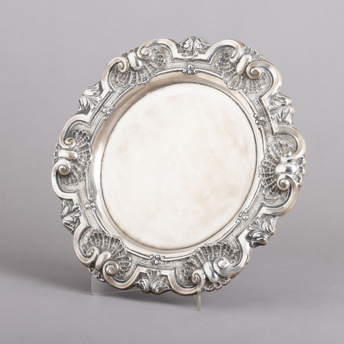 Em prata portuguesa contraste águia (1938-1984) de 833, aba relevada decorada "volutas e concheados". Sinais de uso e amolgadelas no bordo.