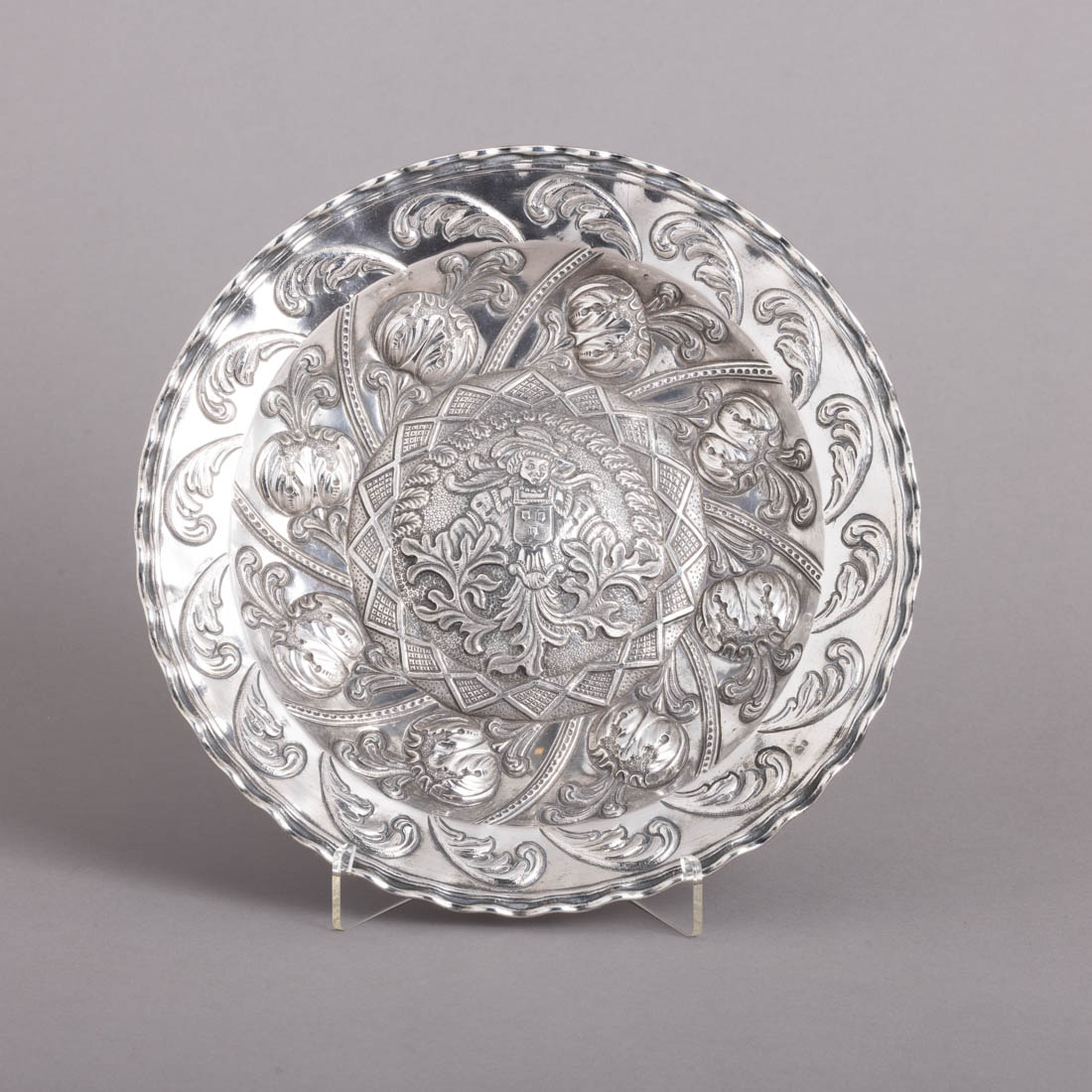 Em prata portuguesa contraste javali (1887-1937) de 833, decoração relevada e gravada "folhas de acanto, flores e figura com escudo". Sinais de uso.