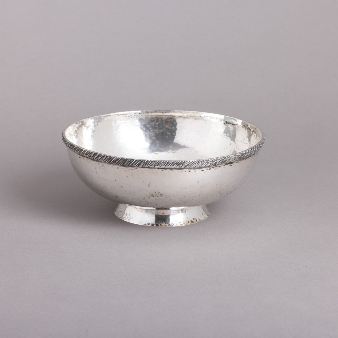 Em prata portuguesa contraste águia (1938-1984) de 833, decoração martelada, bordo relevado. Sinais de uso e leves pontos de oxidação.