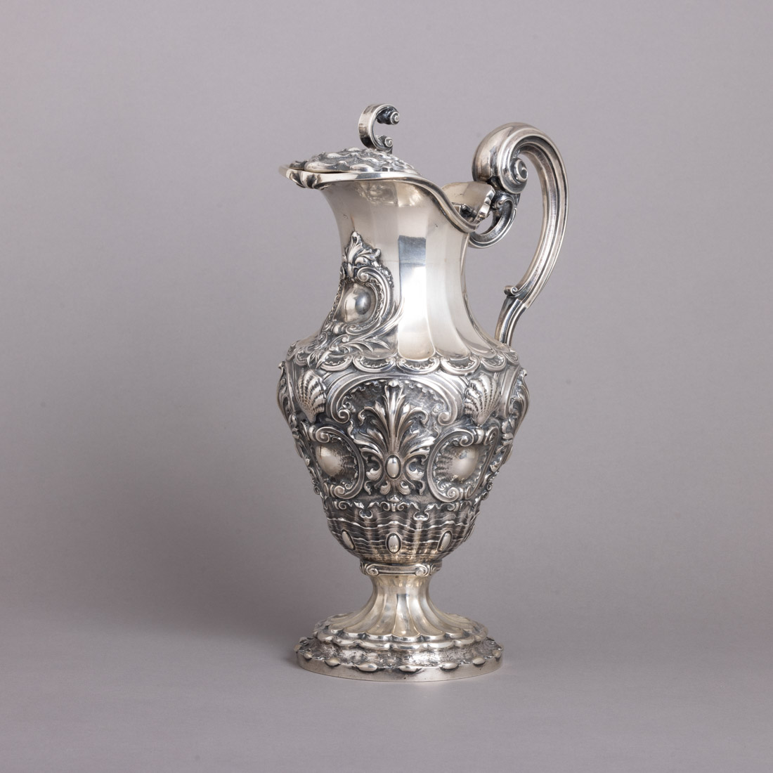 Em prata portuguesa contraste javali (1887-1937) de 833, decoração gomada e relevada "elementos vegetalistas e concheados", assinada. Sinais de uso.
