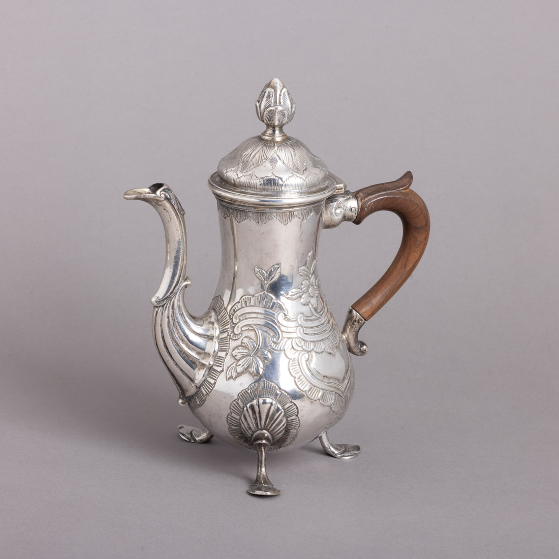 Em prata portuguesa do Séc. XIX, decoração relevada e gravada "flores, enrolamentos e folhas de acanto", pega em madeira. Sem marcas, ao abrigo do Decreto-Lei n.º 120/2017. Sinais de uso, leves amolgadelas e pequenos defeitos. Peso total aprox.: 652 g. Dim.: 24,5 cm.