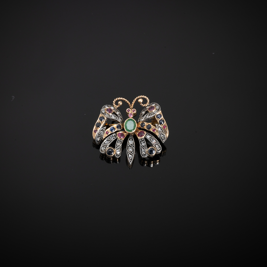 Em ouro português de 19,2Kt., e prata contraste cão e galo (1938-1984), cravejado com esmeralda, rubis, safiras e diamantes em talhe rosa. Sinais de uso.