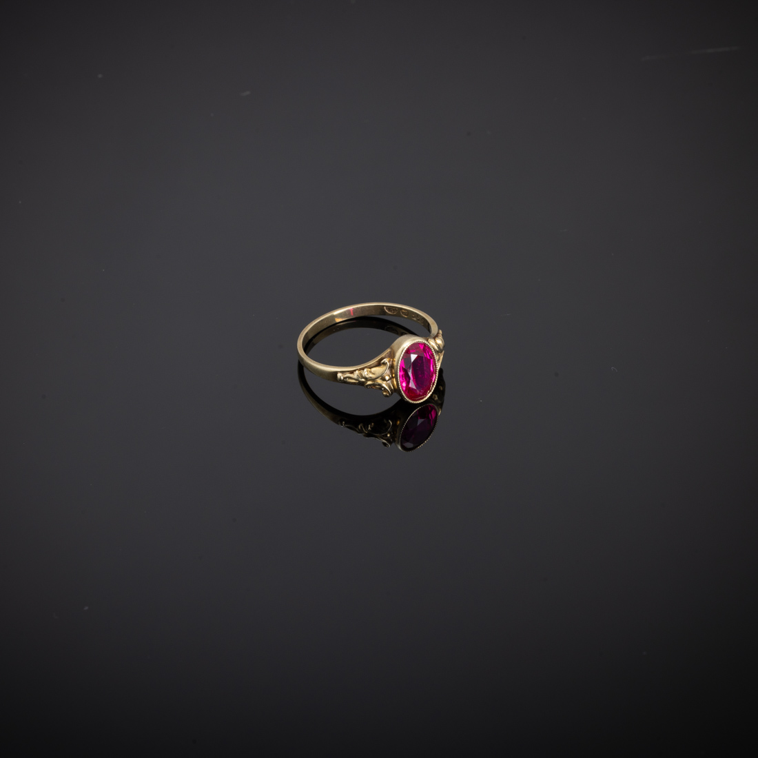 Em ouro de 8Kt., marcas de garantia de teor, decoração relevada, cravejado com rubi. Sem marcas portuguesas, ao abrigo do Decreto-Lei n.º 120/2017.