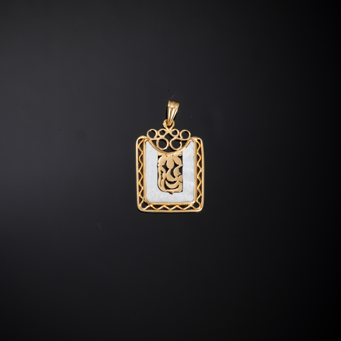 Em ouro português de 19,2Kt., contraste veado (pós 1985), decoração vazada e madrepérola com gravados. Sinais de uso.