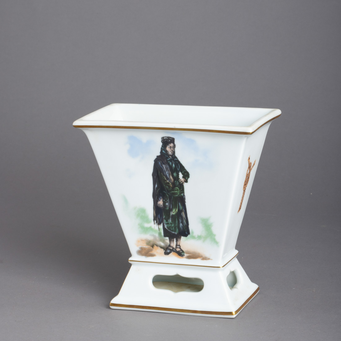 Em porcelana moldada (1980-1992), decoração policromada e dourada, com inscrição na base "Ílhavo Carnaval 1988 - Peixeira - Primeira metade do Séc. XX". Série limitada nº. 83/500. Sinais de uso.