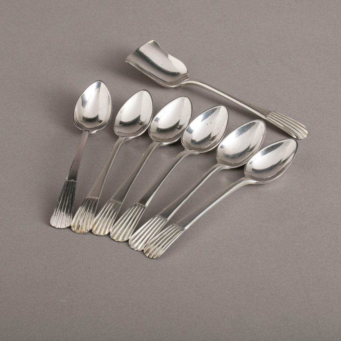 677. CONJUNTO DE SEIS COLHERES DE CHÁ E CONCHA DE AÇÚCAR