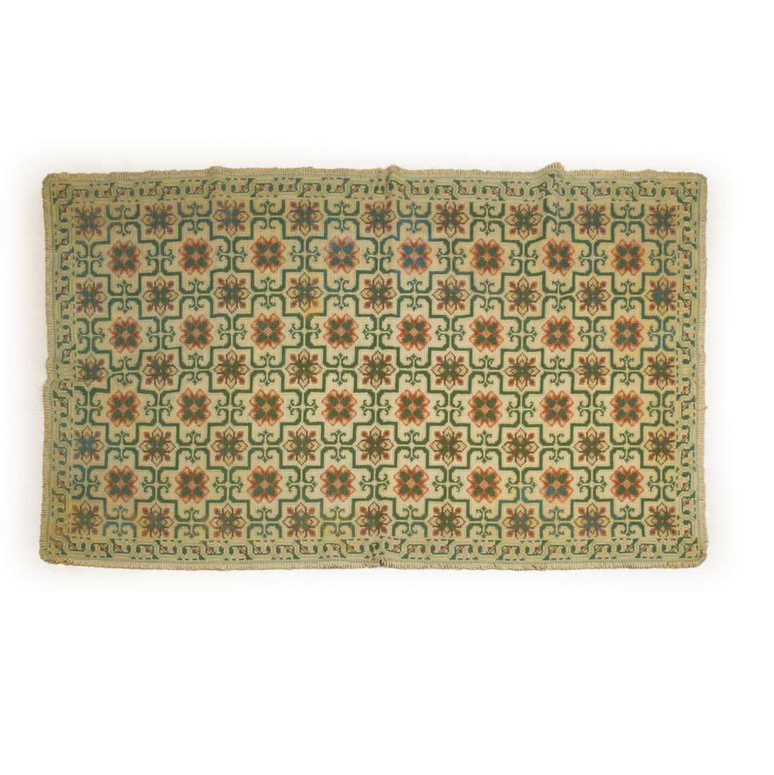 Bordado a fio de lã, decoração policroma com motivos vegetalistas. Sinais de uso e pequenos defeitos.