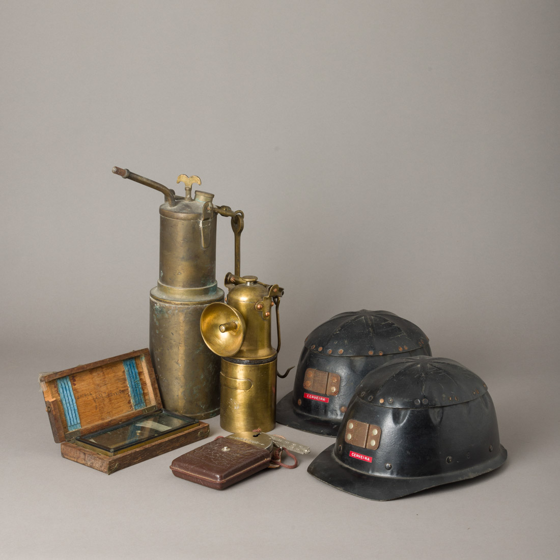 Em diferentes materiais, composto por dois capacetes, duas lanternas e duas bussolas. Pequenos defeitos.