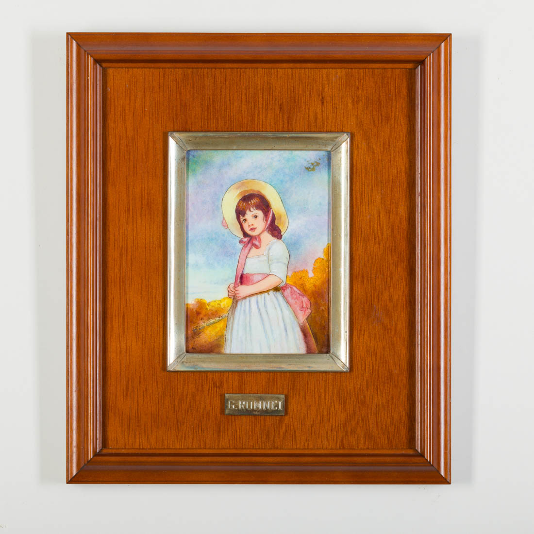 Placa em esmalte decoração policroma, ao gosto de Limoges (reprodução) moldura interior em prata espanhola de 915 marcas de garantia de teor (pós 1934), decoração lisa, aplicada sobre madeira. Sinais de uso. Dim.: 20x15,5;38x32,5 cm.