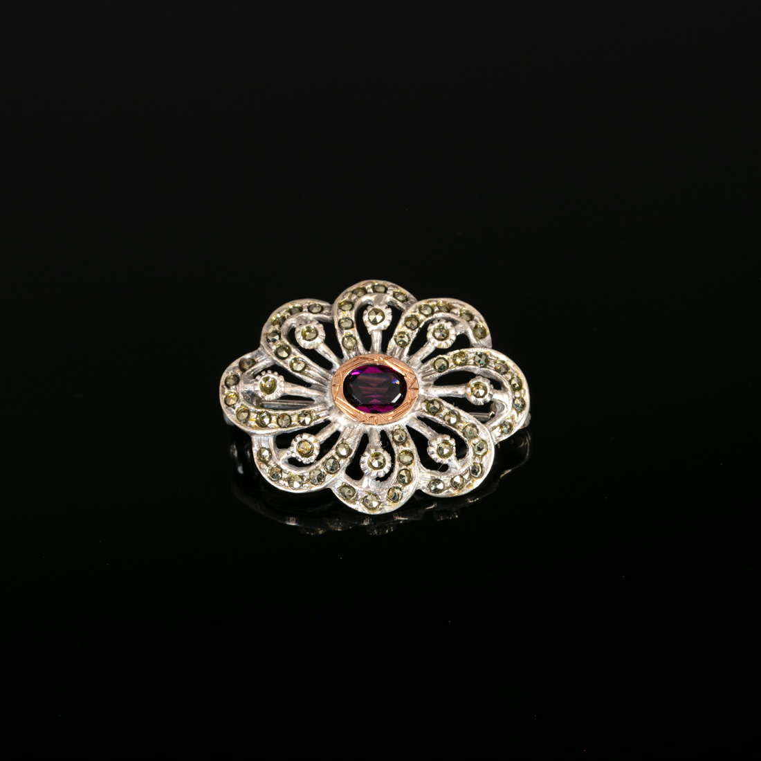 Em prata portuguesa contraste águia (pós 1985) de 835, cravejado com marcassites. Sinais de uso.