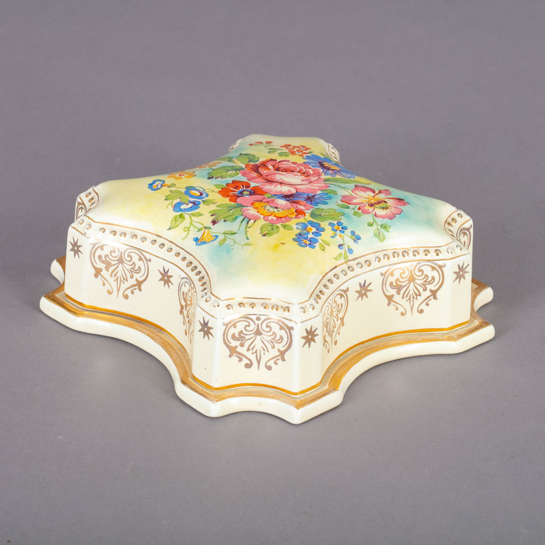 Em loiça pó de pedra de Sacavém, decoração policromada e dourada "flores", marcada Gilman & Cª. - Portugal. Sinais de uso, base com craquelé e ligeiro desgaste no dourado.
