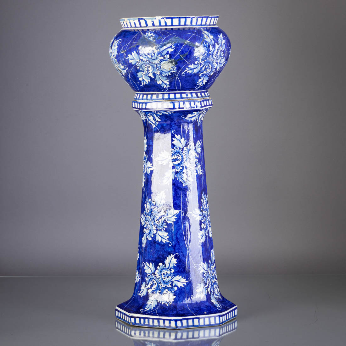 Em faiança portuguesa, decoração a azul "flores". Coluna com pequenas falhas e cachepot colado e restaurado.