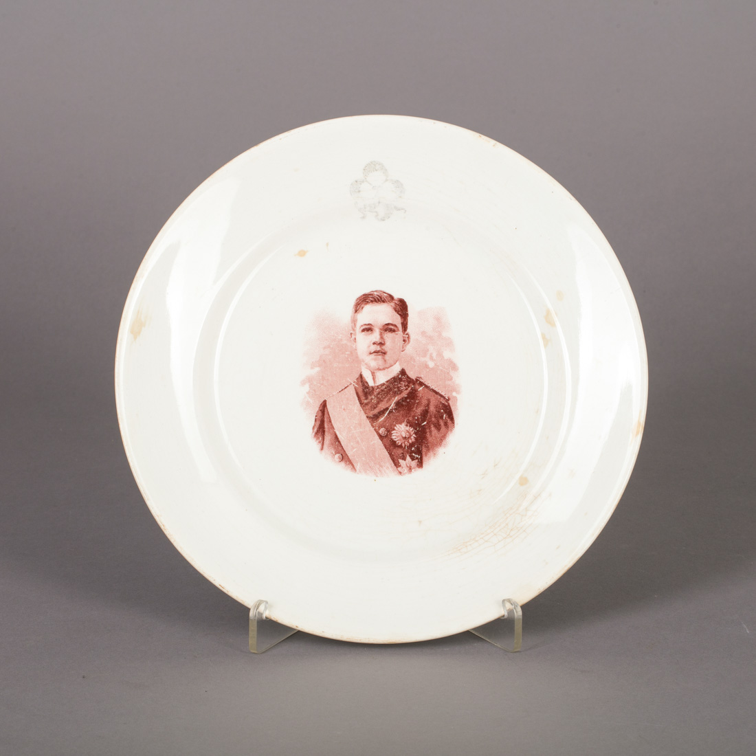 Em loiça pó de pedra, decoração estampilhada com efígie de Sua Majestade o Rei D. Manuel II, ainda como Príncipe herdeiro. Sinais de uso, craquelé e cabelos.