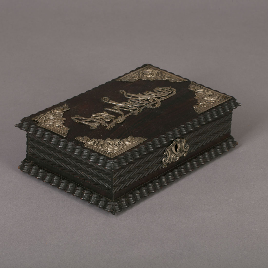 Em pau santo com tremidos, aplicações em prata portuguesa contraste javali (1887-1937) de 833, decoração relevada. Pequenas falhas e faltas na prata.