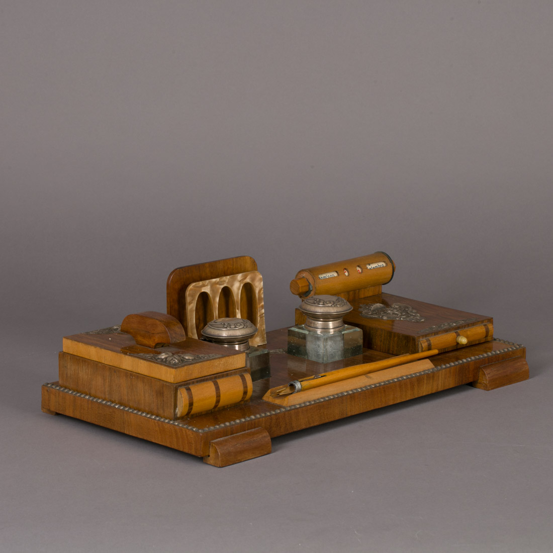 Folheado a raiz de nogueira, aplicações em prata portuguesa contraste águia (1938-1984) de 833, decoração relevada diversa, tinteiros em vidro com mata-borrão, porta bloco e calendário. Sinais de uso, pequenos defeitos.