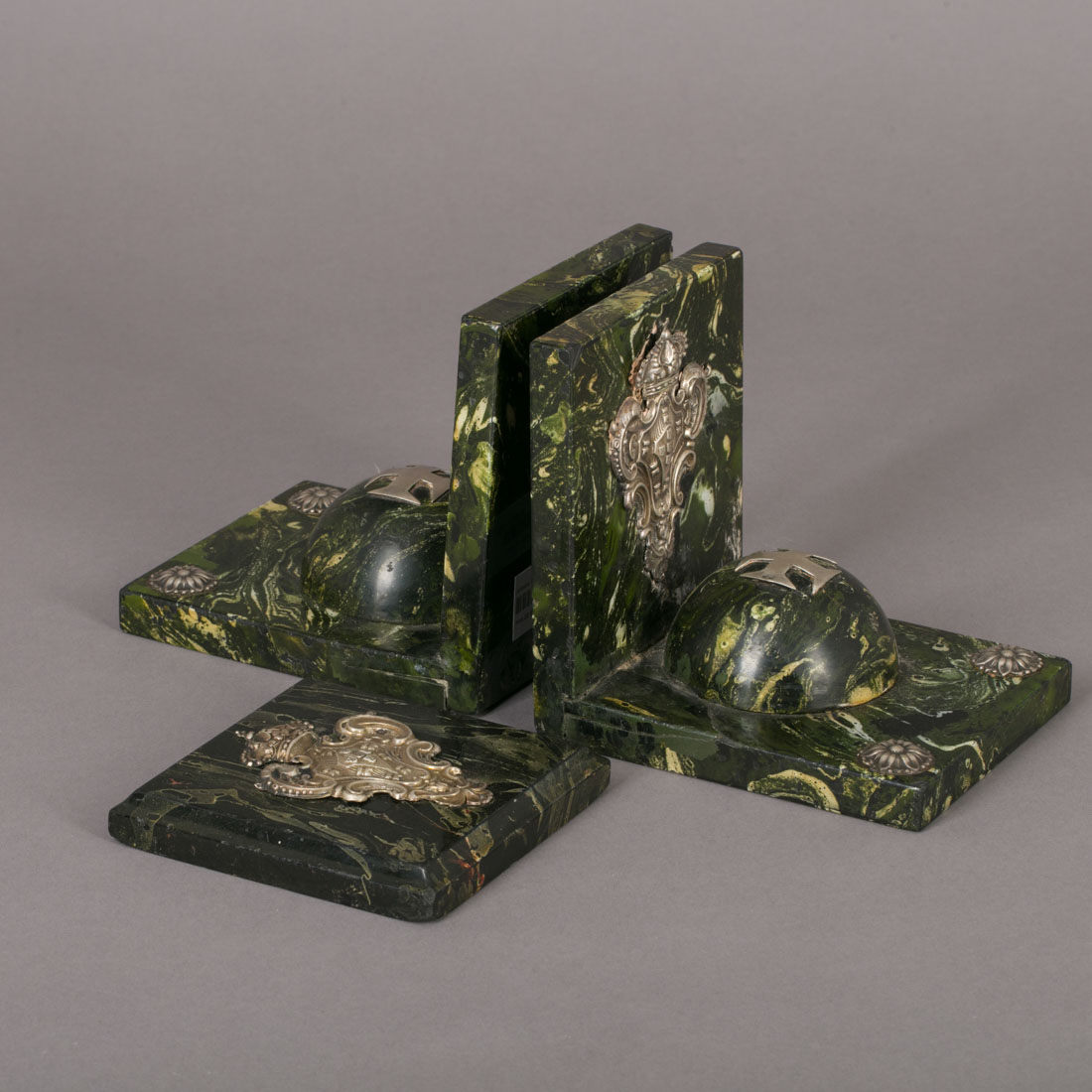 Em pedra simulando mármore, aplicações em prata portuguesa contraste javali (1887-1937), decoração relevada "Armas de Portugal" e "Cruz de Cristo". Ligeiras esbeiçadelas, pisa-papéis com restauro.