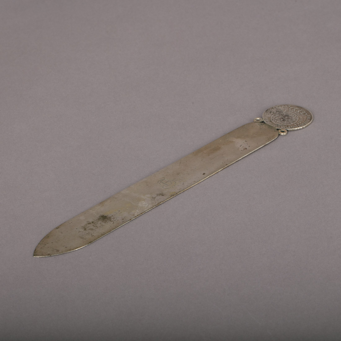 Em prata portuguesa, decorada com moeda de 400 reis de 1821, monogramada. Sem marcas, ao abrigo do Decreto-Lei n.º 120/2017. Sinais de uso.