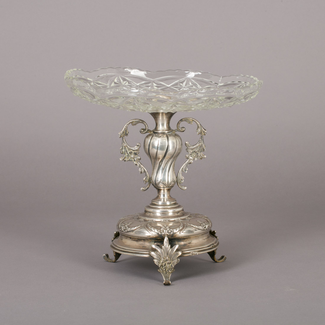 Em prata portuguesa contraste javali (1887-1937) de 833, decoração relevada com grinaldas e elementos vegetalistas, taça recortada em vidro moldado. Sinais de uso.