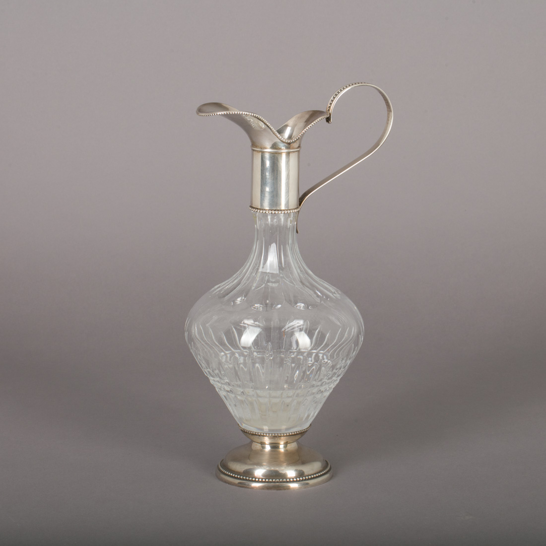 Em cristal moldado, gargalo, asa e base em prata portuguesa contraste águia (pós 1985) de 925, marcada Flamingo, decoração lisa com frisos perlados. Sinais de uso, pequena amolgadela na base.