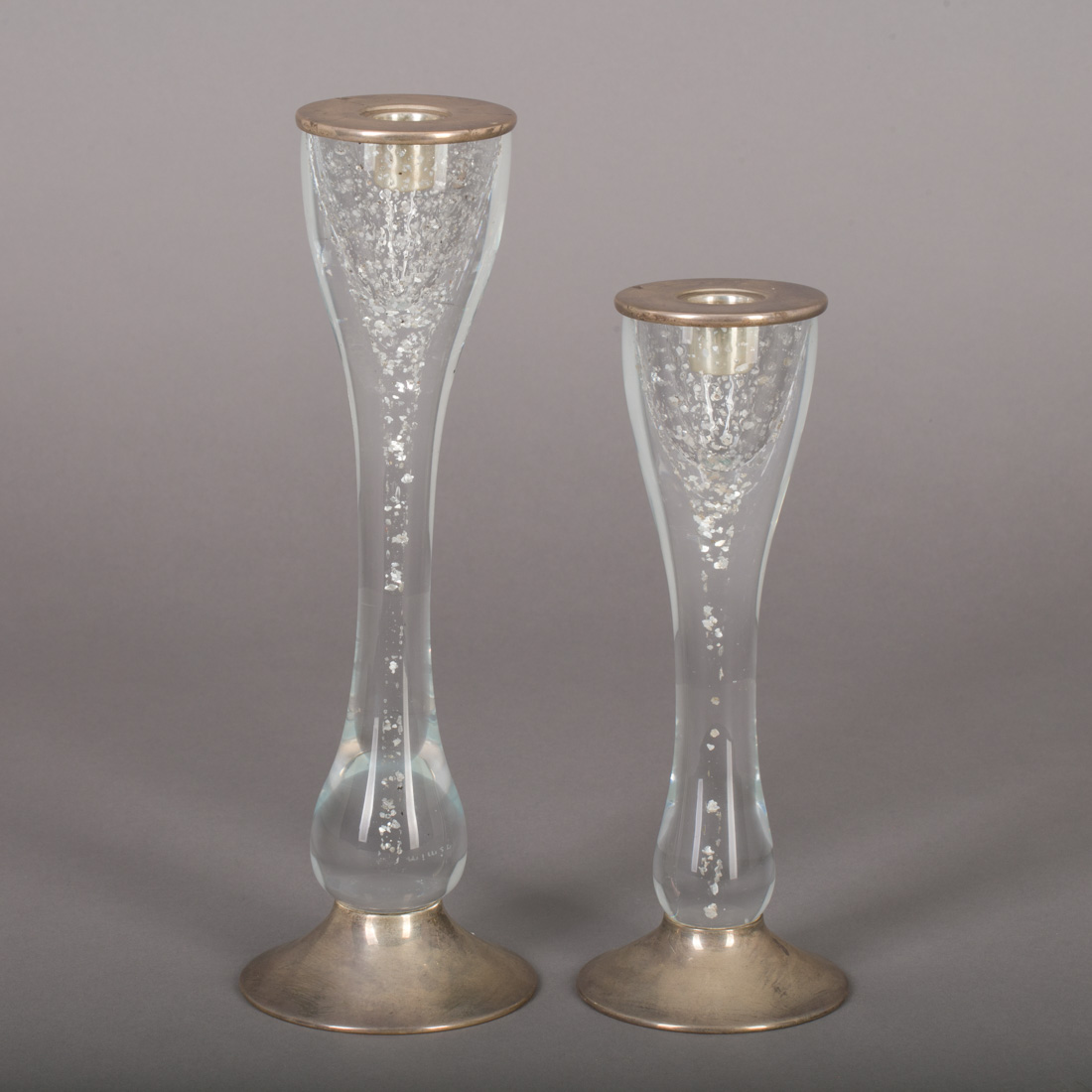 Em vidro moldado com inclusões a prata, base e bobeche em prata portuguesa contraste águia (pós 1985) de 925, marcada Topázio. Sinais de uso.