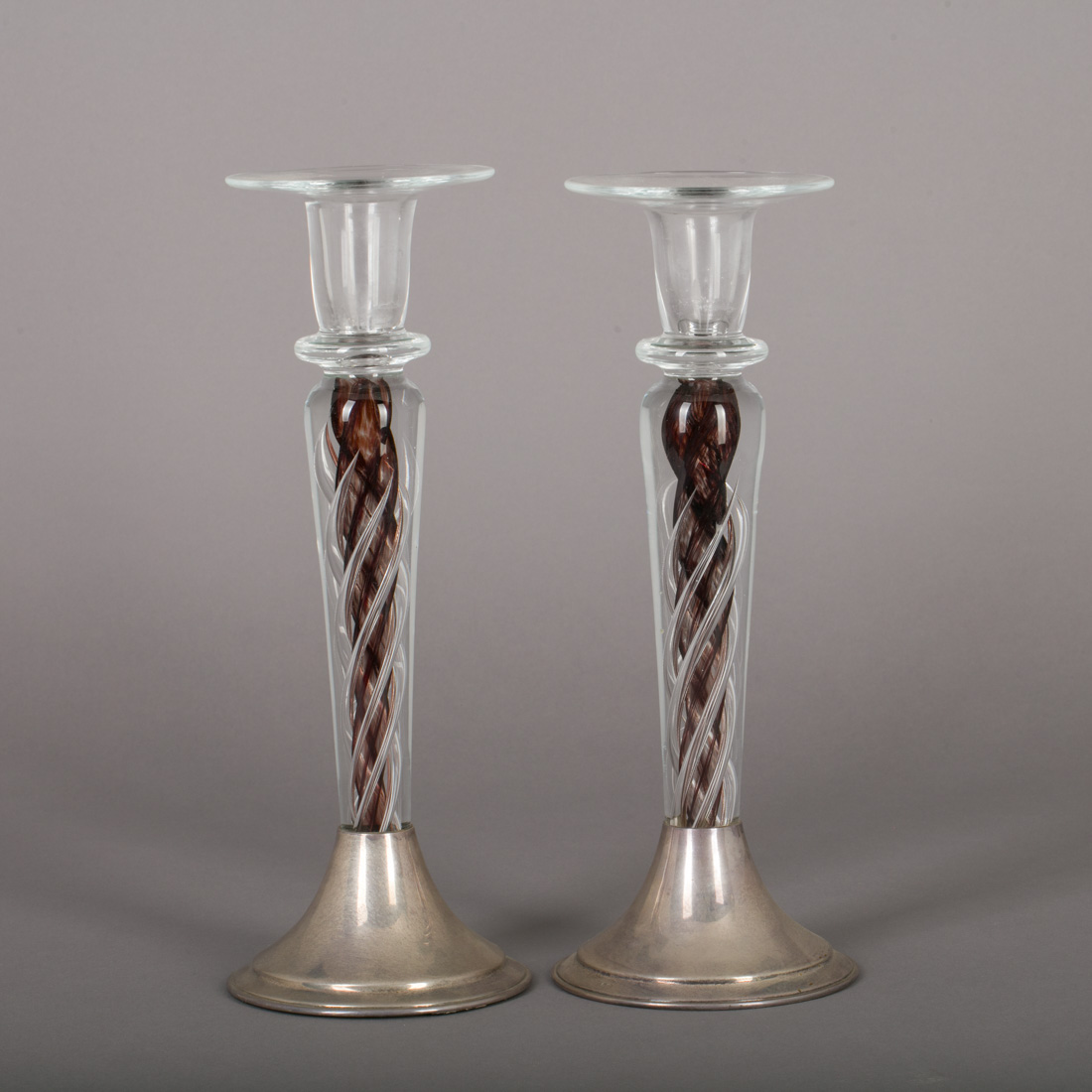Em vidro bicolor com interior espiralado, base em prata portuguesa contraste águia (pós 1985) de 925. Sinais de uso.