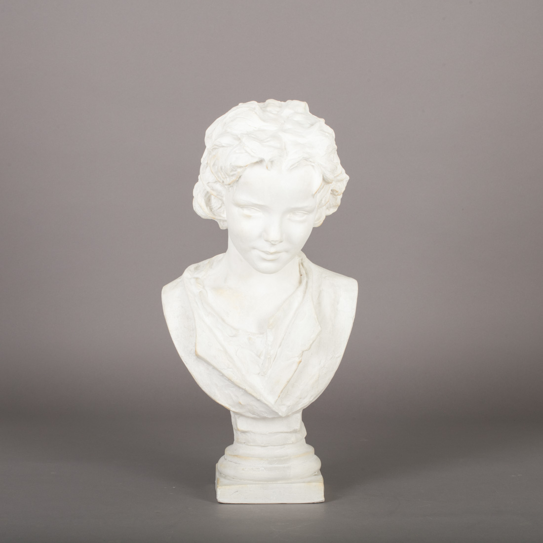 Escultura em gesso, decoração monocroma a branco, assinado e datado 1878. Sinais de uso e falhas.