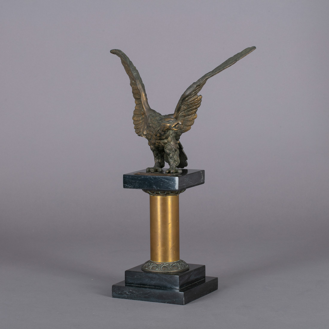 Escultura em bronze de arte patinado, plinto em mármore e metal dourado. Sinais de uso.