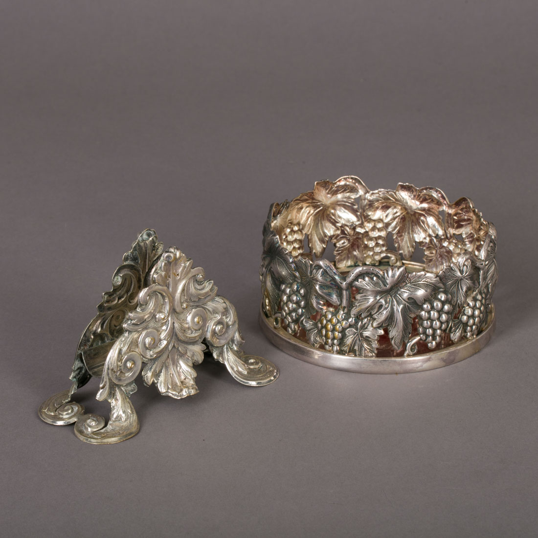 Em casquinha da Topázio, decoração relevada e vazada com elementos vegetalistas, parras e uvas. Sinais de uso, base com ligeiro desgaste.
