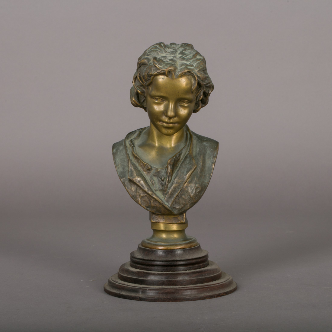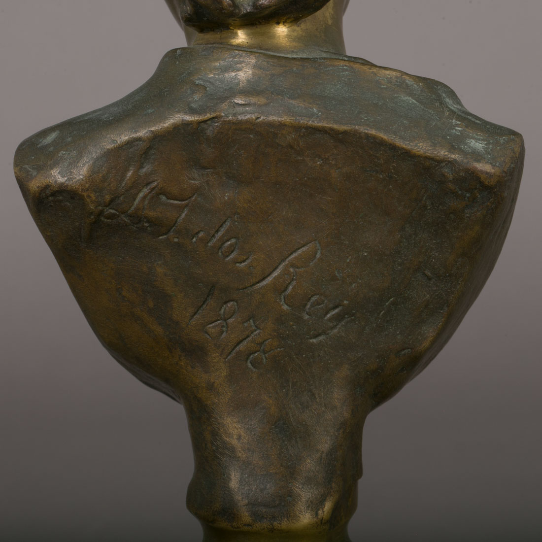 Escultura em bronze patinado, base em madeira, assinada e datada 1878. Sinais de uso.