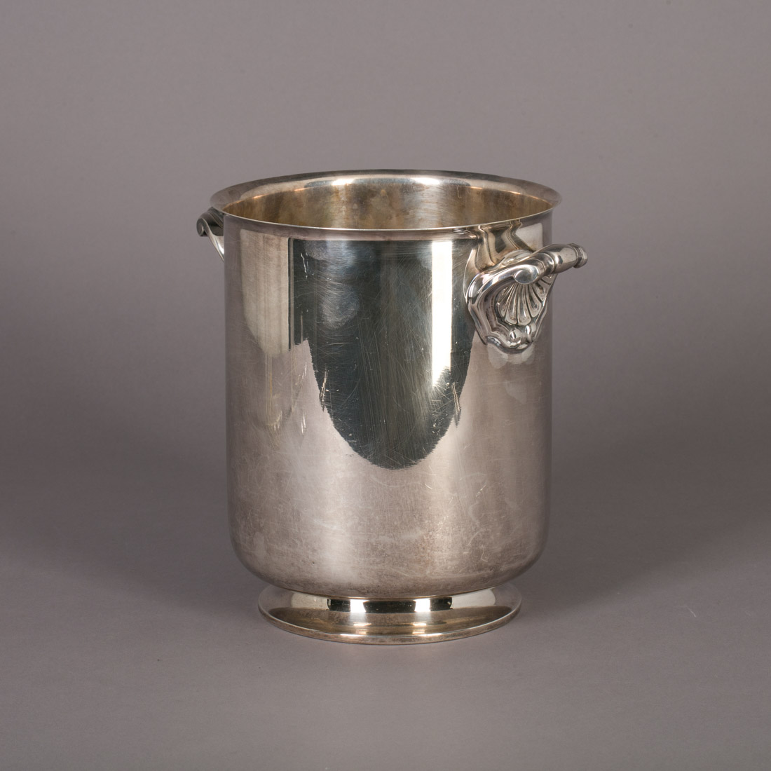 Em metal prateado decoração lisa, pegas relevadas com concheados. Marcado. Sinais de uso.