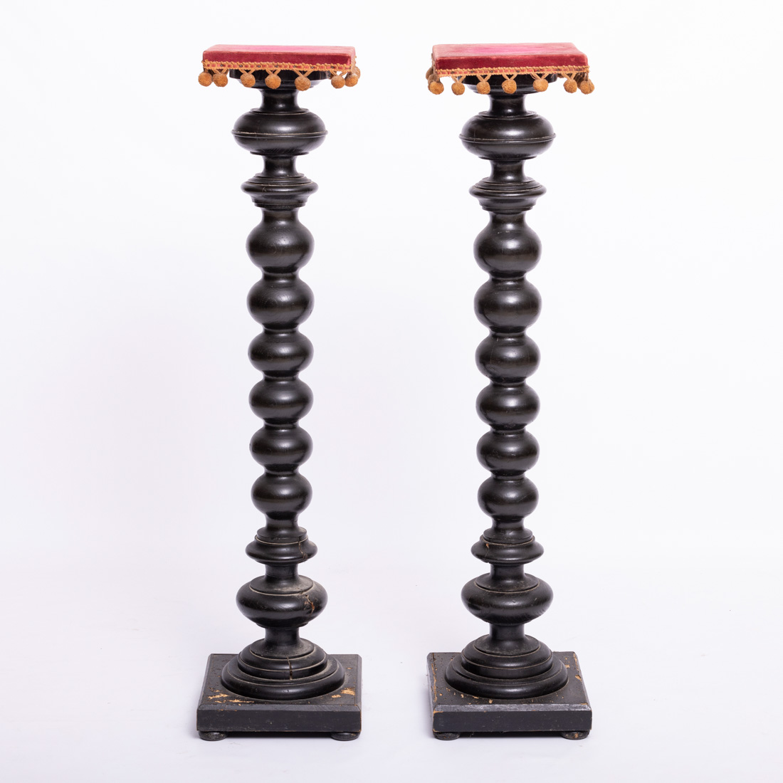 Em madeira escurecida torneada, topos quadrangulares forrados a veludo e bases também quadrangulares. Vestígios de xilófagos, pequenas falhas e defeitos.