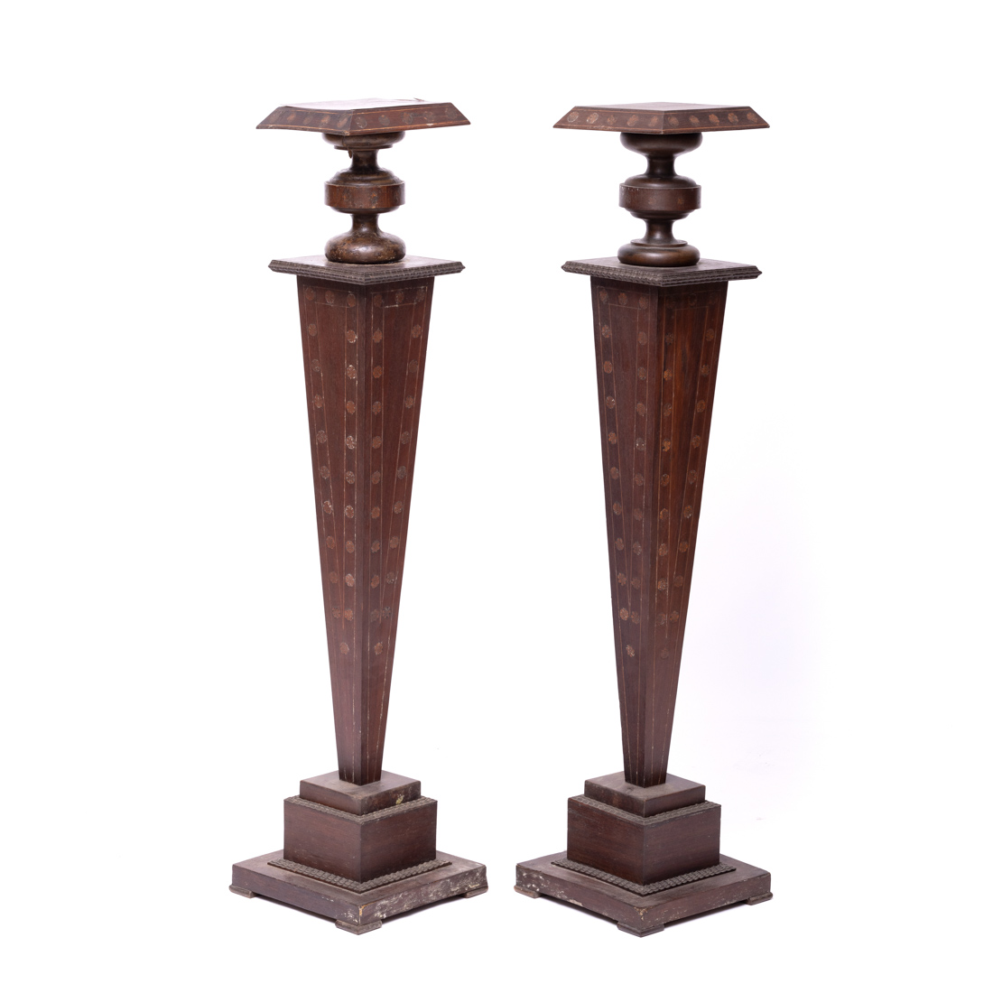 Em madeira com embutidos em forma de rosáceas. Pequenas falhas, defeitos e vestígios xilófagos.