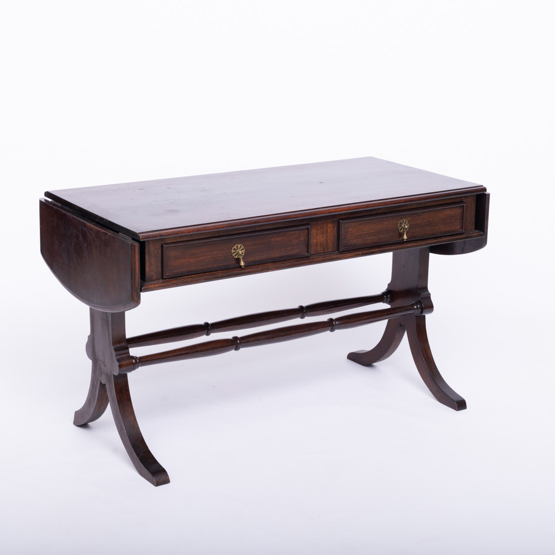 Em mogno e folheada a mogno, com abas laterais e de duas gavetas, travessas torneadas. Pequenas falhas e defeitos.