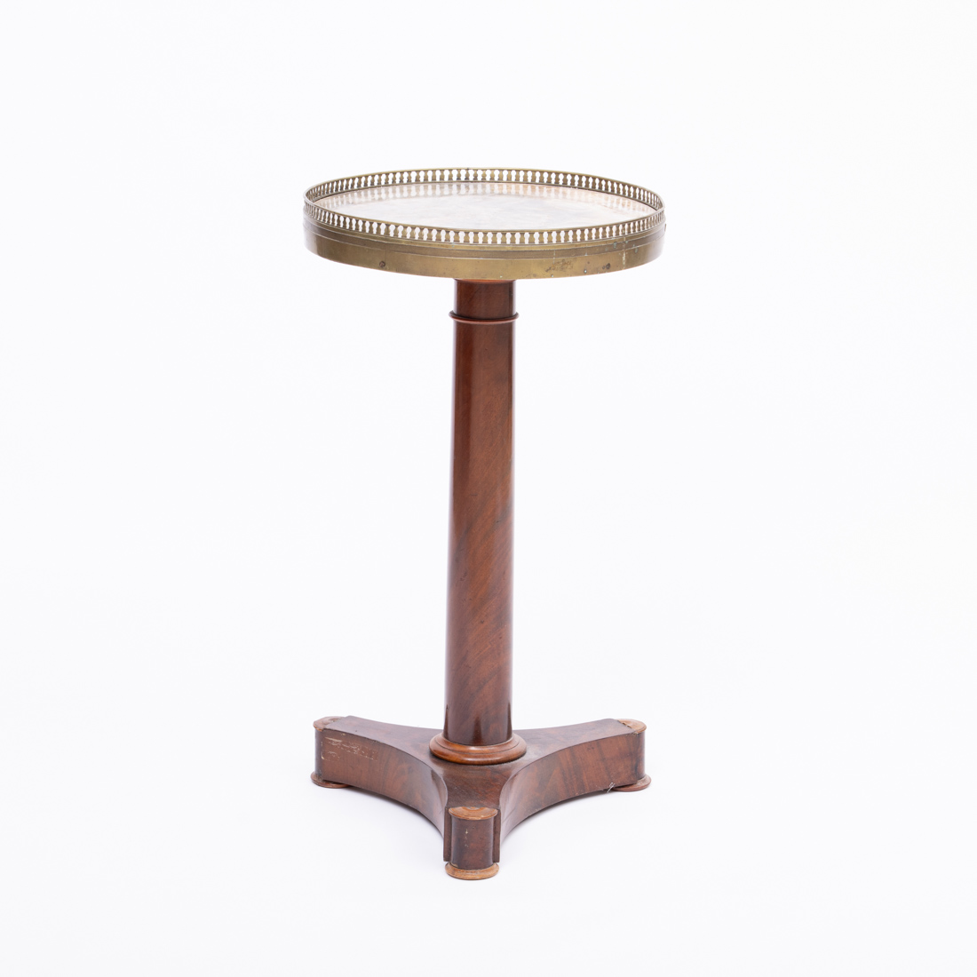 Estilo Império, em mogno e folheada a mogno, tampo circular em mármore, moldura de gradinha em metal amarelo, coluna central torneada, base recortada. Pequenas falhas e defeitos.