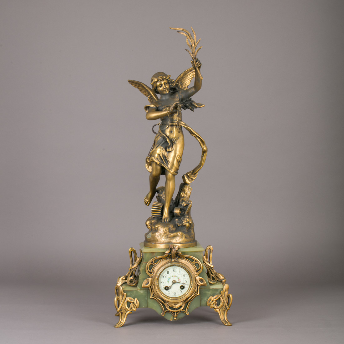 Estilo Arte Nova, em bronze de arte dourado e mármore verde, mostrador em esmalte com numeração árabe "flores", escultura assinada J. Garnier. A funcionar. Com chave. Falta pêndulo, pequenos defeitos.