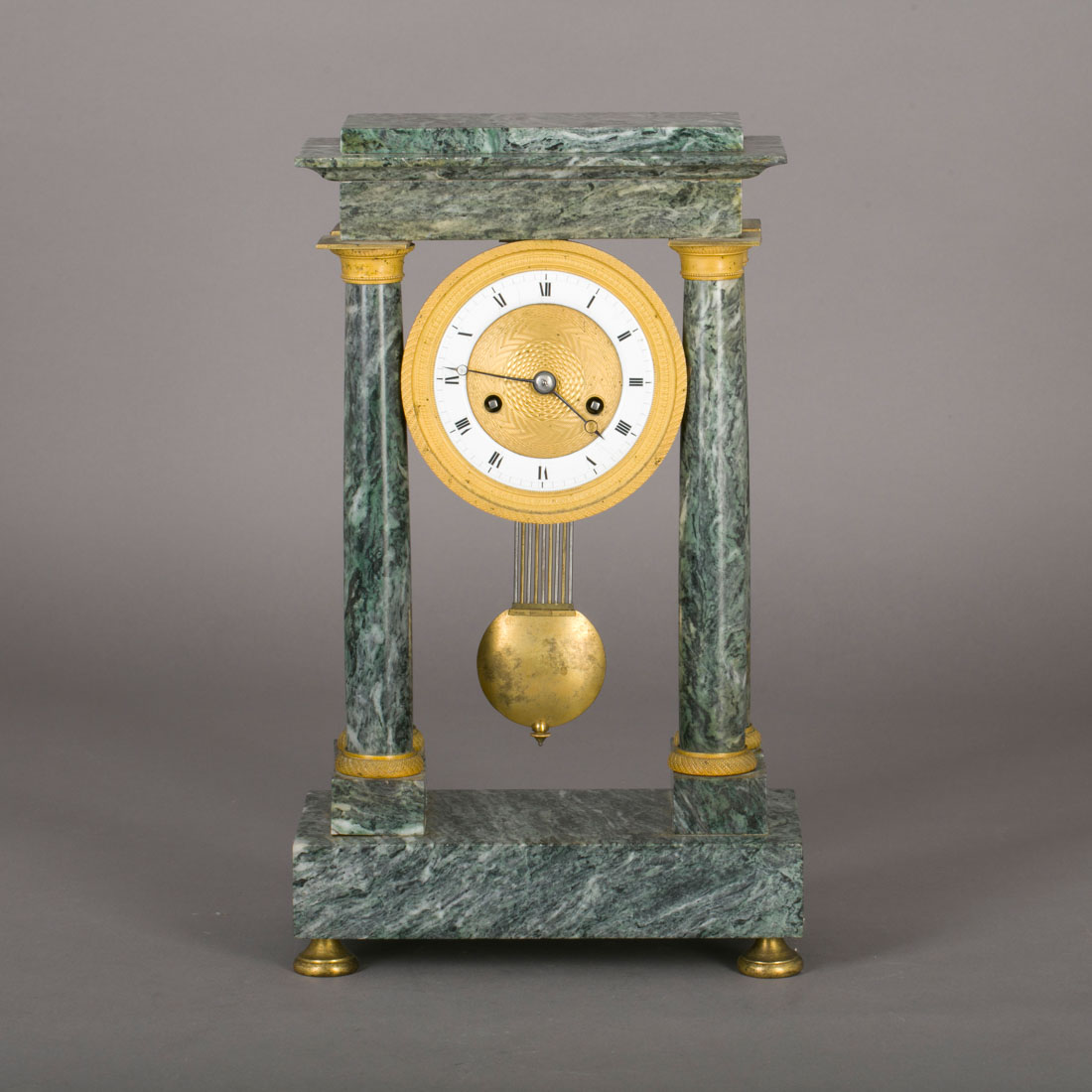 Em mármore e bronze dourado, mostrador em bronze gravado e esmalte com numeração romana. Com chave e pendulo. Sinais de uso.