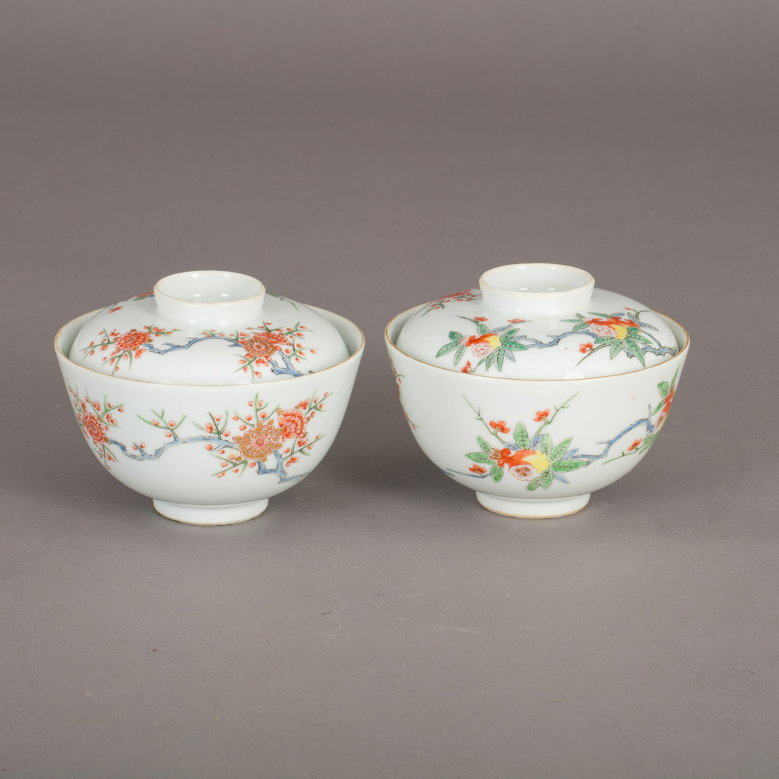 Em porcelana da China, decoração policromada e dourada "flores e frutos". Sinais de uso, esbeiçadelas, uma tampa com pequeno cabelo.