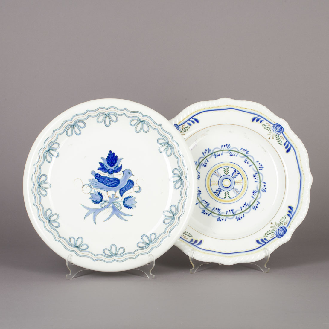 Em loiça de Viana do Castelo, decoração policromada "flores e pássaro", um de bordo recortado e relevado. Sinais de uso.
