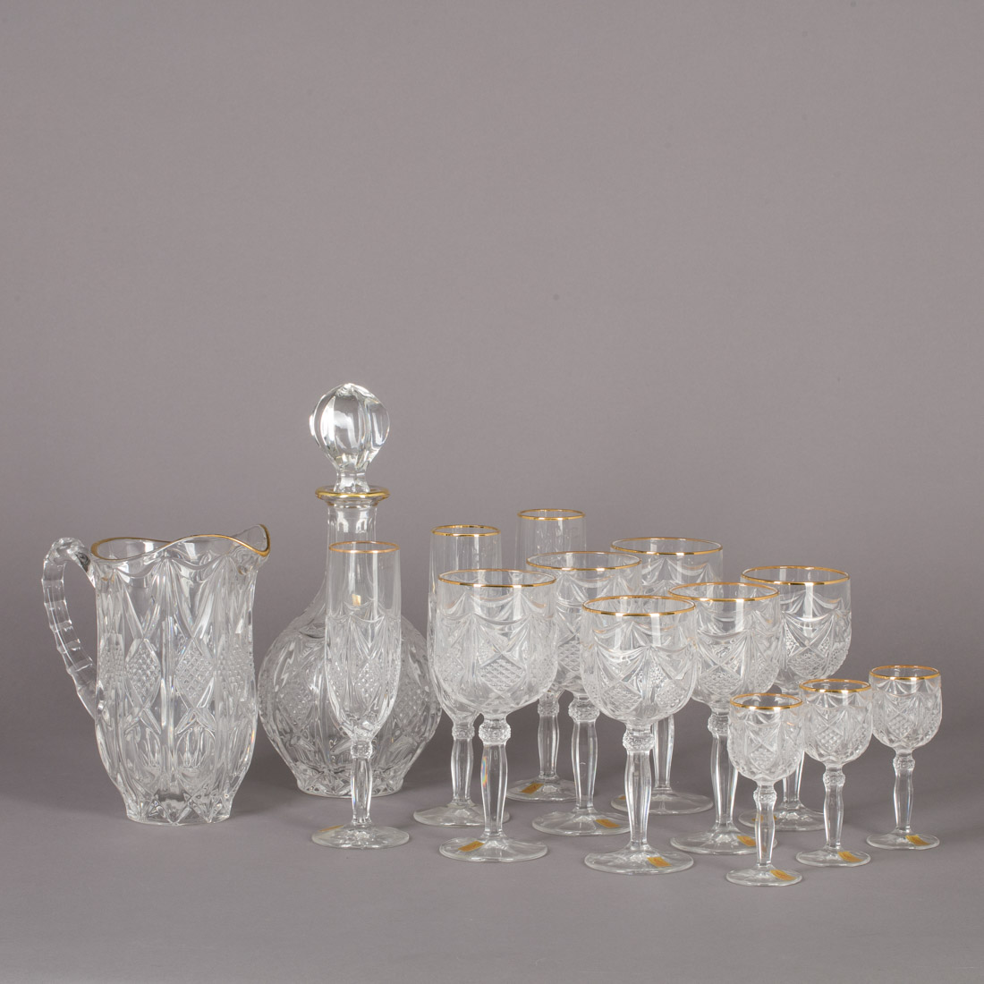 Em cristal decoração relevada com friso dourado, marcado Nachtmann, Alemão. Composto por 12 copos de água, 24 de vinho, 12 flutes, 12 cálices de Porto, garrafa e jarro. Sinais de uso.