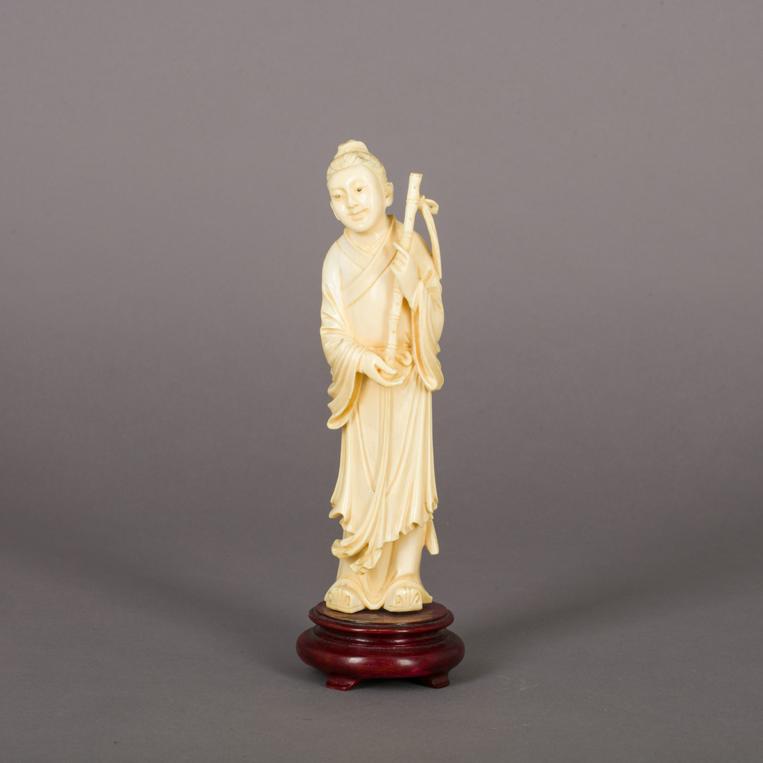 Escultura em marfim. Base em madeira. Japão. Pequenas falhas.