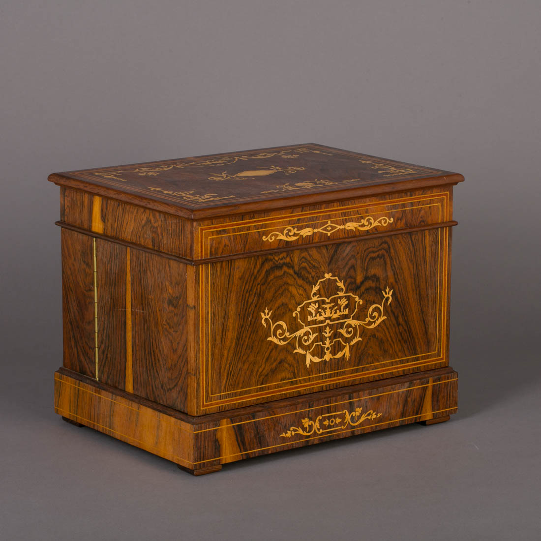 Estilo Napoleão III, com marchetaria em diferentes madeiras com elementos vegetalistas, no interior quatro garrafas e quinze cálices em vidro moldado e gravado. Sinais de uso, um cálice com ínfima esbeiçadela na base.