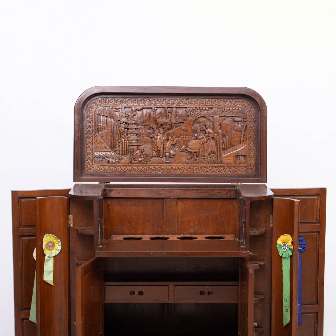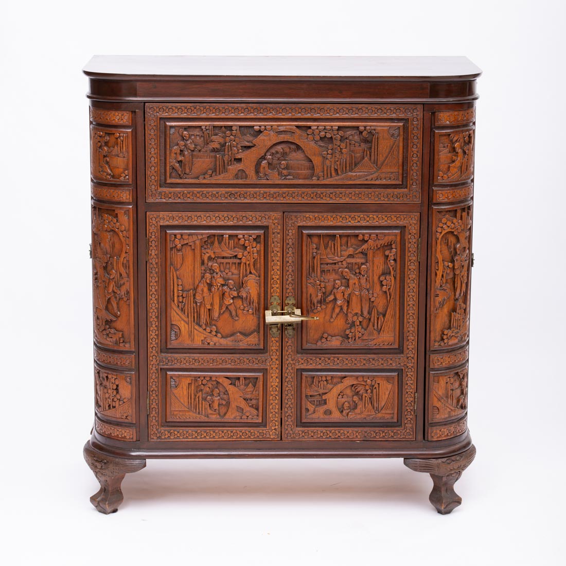 Em madeira exótica entalhada, decoração relevada "paisagens com figuras em cenas do quotidiano", de quatro portas sendo duas laterais. Com chave. Sinais de uso.