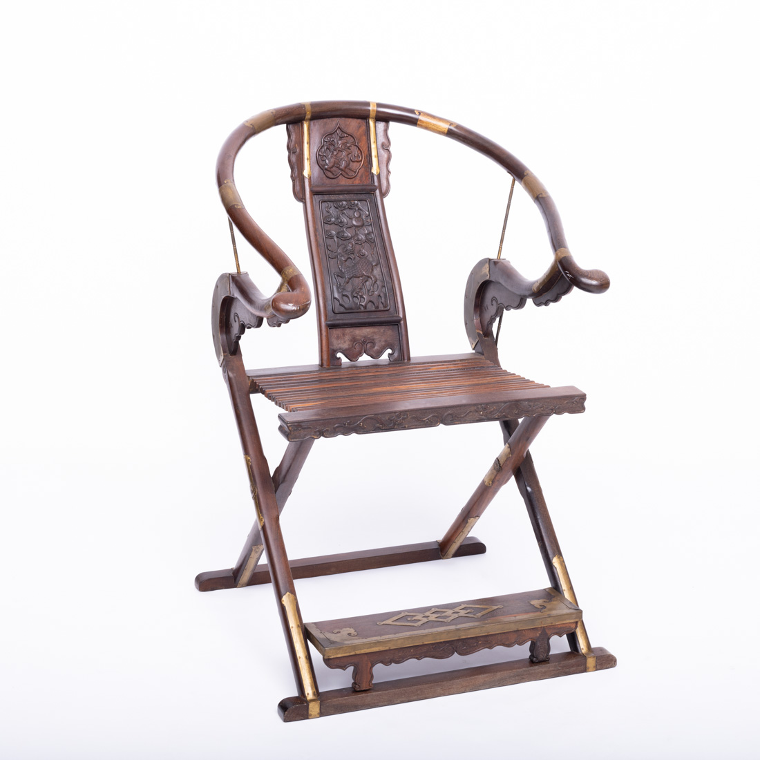 Em madeira exótica, tabela das costas entalhada "cães de foo", aplicações em metal. Chinesa. Pequenos defeitos.