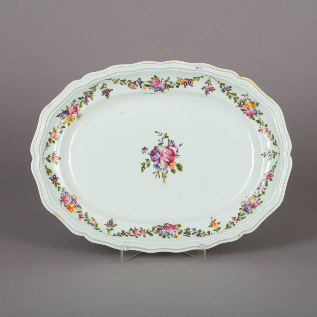 Em porcelana da China, Companhia da Índias, Séc. XVIII, decoração policromada e dourada "grinaldas". Desgaste no dourado e esbeiçadela.