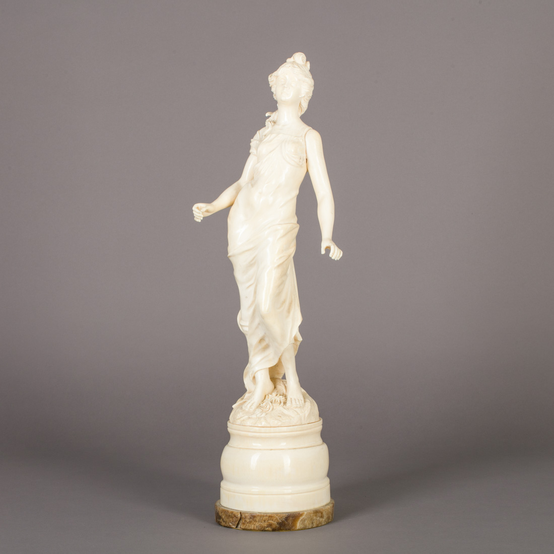 Escultura em marfim, base em mármore. Sinais de uso, dois dedos colados